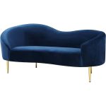 Elegant navy blue velvet Sofa Diwan Couch with curved backrest and golden legs in a modern living room